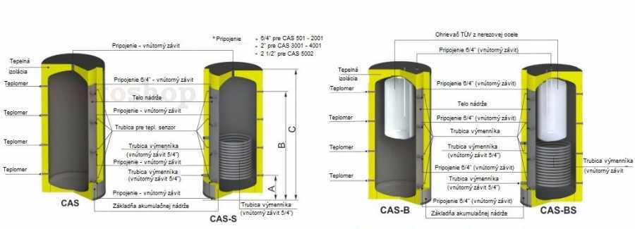 - CAS-B 503 (465 lit.), CAS-B 803 (727 lit.), CAS-B 1003 (920 lit.), CAS-B 1503 (1426 lit.), CAS-B 2003 (2122 lit.) – akumulačná nádrž so zabudovaným nerezovým ohrievačom vody