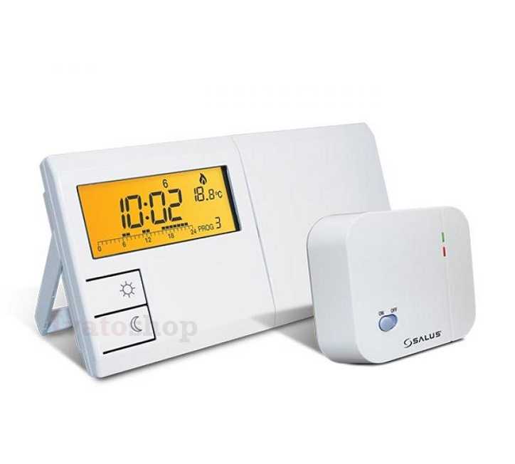 Bezdrôtová verzia najpopulárnejšieho termostatu SALUS 091FL (verzia 2017). Set sa skladá z prímača, ktorý sa pripája ku kotlu dvojlinkovým káblom a vysielača, ktorý reprezentuje samotný izbový termostat. Komunikácia medzi vysielacom a prímačom je realizovaná rádiovo s dosahom na 100 metrov vo voľnom priestore. Cez steny sa tato vzdialenosť trochu zmenšuje. Prímač sa vkladá napríklad do elektrickej zásuvky a pokiaľ je nutné, môžeme cez neho zapojiť aj kotol. Regulácia prímača je dvojbodová a bezpotenciálová. Termostat má podsvietený displej na oranžovú farbu. Batérie sú súčasťou balenia.