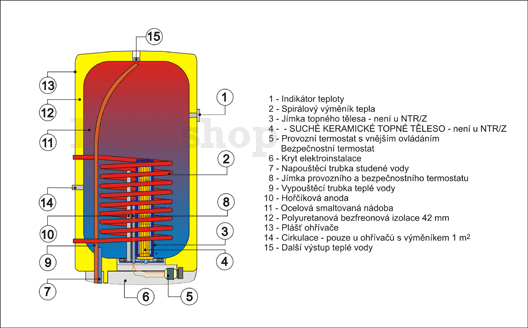 Kombinovaný zvislý ohrievač vody s keramickým výhrevným telesom a jedným výmenníkom pre ďalší zdroj tepla.