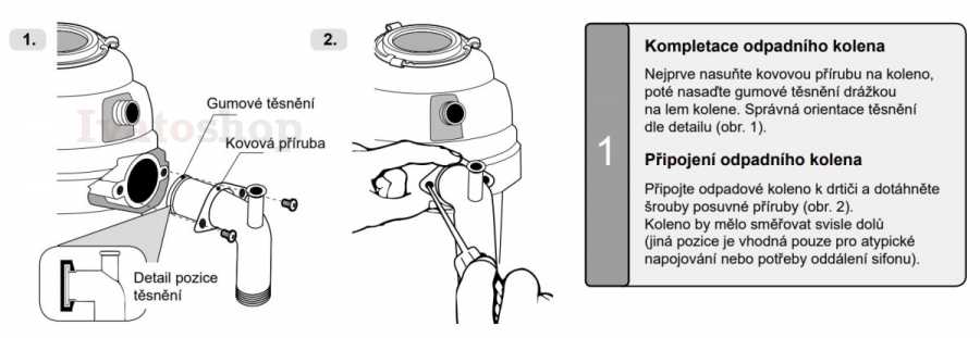 Plastové koleno k připojení odpadního sifonu průměr 40mm k drtiči odpadu EcoMaster. Samostatně bez těsnění, příruby a šroubů. K přídavnému vstupu je možno připojit výstup z myčky nebo přepadu pomocí instalační sady. Možno koupit samostatně nebo jako komplet včetně gumového těsnění, nerezové příruby a dvou šroubů.