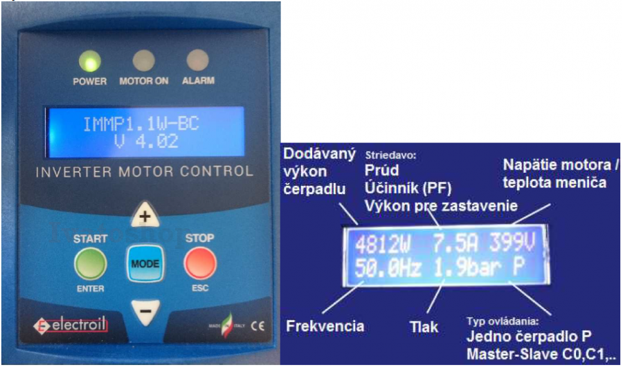 Pri prvom spustení menič vykoná automatický test parametrov čerpadla (pri ktorom musí byť zavretý ventil na výtlaku) a nastaví tlak regulácie na 3 Bary. Prúd meniča aj ochrana proti chod na sucho je prednastavená. Čerpadlo zastavíme, spustíme, tlak pridáme, uberiame jednoducho a rýchlo, kedykoľvek keď potrebujeme .