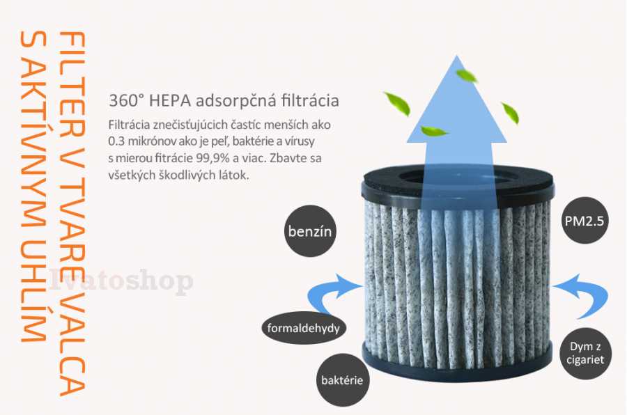 Filtráciou vzduchu cez HEPA filter s aktívnym uhlím sa vzduch prečistí a do miestnosti prúdi svieži a čerstvý. HEPA filter z mikrovlákna s veľkosťou pórov 0,01 μm a s prímesou aktívneho uhlia dosahuje mieru filtrácie vzduchu viac ako 99,9%. Prírodný aktívny uhlík z kokosových škrupín má veľký špecifický povrch, vysokú pevnosť, rovnomernú veľkosť častíc, dobre vyvinutú štruktúru pórov, silnú adsorpčnú kapacitu a nízku odolnosť. Dokáže eliminovať zápach a účinne zachytiť a rozložiť rôzne škodlivé plyny, ako je formaldehyd, toluén a TVOC – prchavé organické zlúčeniny.