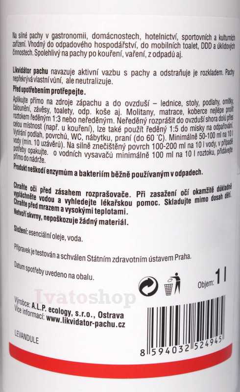 Jedná se o zcela přírodní - zdravotně nezávadný přípravek, který zápach nejen neutralizuje, ale díky přírodním esenciálním olejům příjemně provoní okolní vzduch.