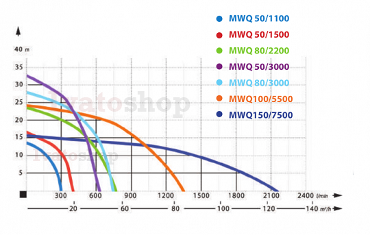 Séria ponorných čerpadiel na odpadové vody MWQ je určená na čerpanie surovej odpadovej vody z čerpacích staníc, kde môže byť prítomný hustý sediment. Čerpadlá sú vybavené špeciálnym vonkajším obežným kolesom (miešadlom) na miešanie a rozdeľovanie ťažkých sedimentov. obežné koleso, miešadlo je vyrobené z nehrdzavejúcej ocele a komora motora je utesnená dvojitým mechanickým tesniacim systémom SiC / SiC. Motor je 3-fázový, 2-pólový asynchrónny s vinutím motora s izoláciou triedy F. Čerpadlo je vybavené ložiskami NSK bez údržby.