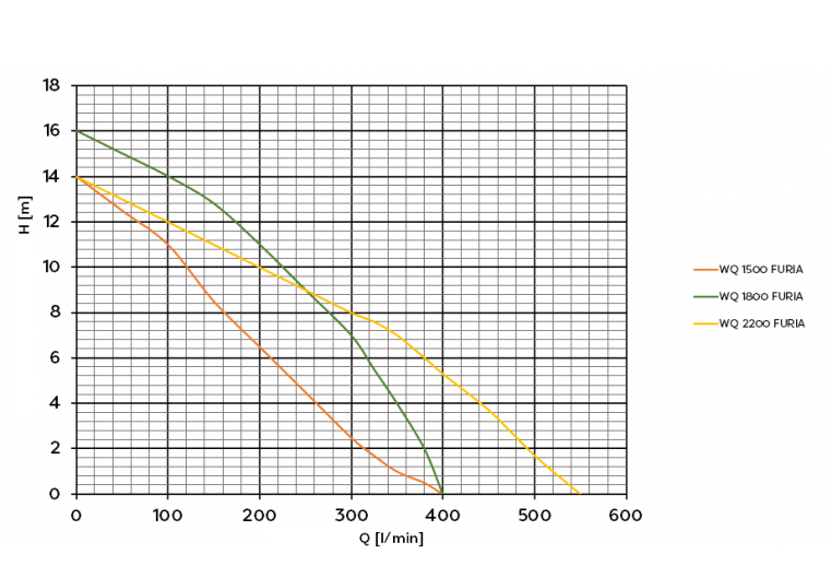Ponorné čerpadlo WQ 1800 FURIA s rezačom je vysokovýkonné čerpadlo určené na splaškovú, kalovú, špinavú vodu s prítomnosťou organických a domácich nečistôt. Čerpadlo má mlecí systém, ktorý predreže čerpané médium na kúsky, čím sa zabráni upchatiu tlakovej časti v potrubí. Čerpadlo má plavákové ovládanie, ktoré riadi aktiváciu v závislosti od výšky hladiny čerpaného média a chráni čerpadlo pred chodom nasucho. Čerpadlo je vybavené nadprúdovou ochranou na napájacom kábli, ktorá chráni motor zariadenia pred preťažením v prípade zablokovania obežného kolesa napr. WQ 1800 FURIA možno úspešne použiť ako čerpadlo na vyprázdňovanie odpadových nádrží na vidieckych a domácich farmách. Čerpadlá z výroby sú prispôsobené k pripojeniu ku kalovým hadiciam. V prípade pripojenia čerpadla k inému druhu hadice má čerpadlo vnútorný závit.
