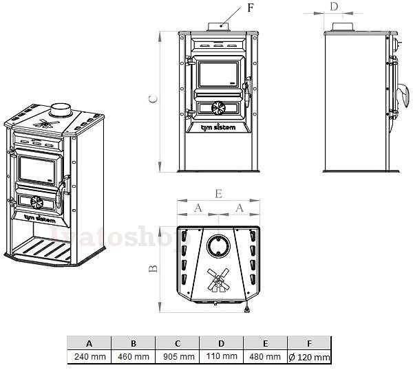 Rozmery spaľovacej komory: šírka 30 cm, hĺbka 35 cm, výška 25 cm.