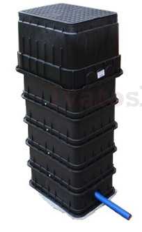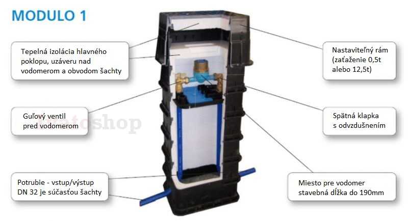 Vodomerná šachta rady MODULO je dodávaná ako kompletne pripravená šachta k osadeniu vo verzii pre jeden alebo dva vodomery veľkosti 15 s pripojením PE ø 32 s nastaviteľnou výškou od 1300 do 1600 mm (štandard 1300 a 1600). Je vybavená rohovou vodomernou zostavou s otvoreným dnom pre priame uloženie do výkopu, toto riešenie využíva zemné teplo, ktoré spolu so zateplením šachty zaisťuje maximálnu ochranu proti mrazu. Šachta je mimoriadne mechanicky odolná s poklopom prevedeným podľa normy NF EN 124 - s nosnosťou až 12,5 t.