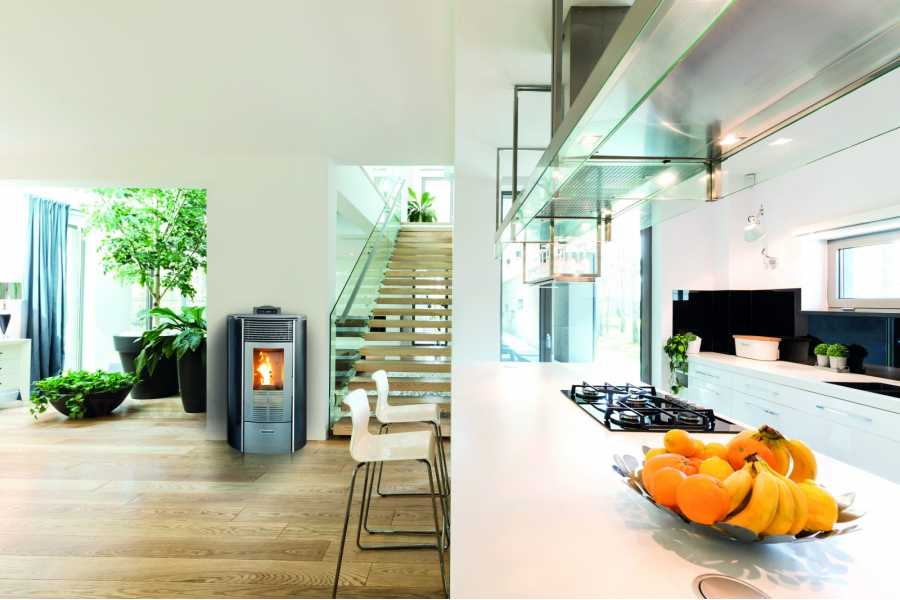 - Peletová pec na teplovzdušné vykurovanie vháňaním horúceho vzduchu do priestoru.