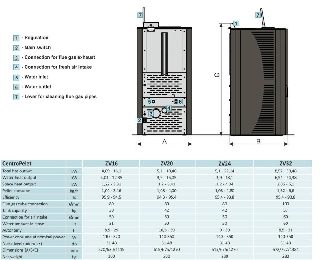 Teplovodné peletové izbové pece CentroPelet ZV sú kachle na drevené pelety určené na zohrievanie miestnosti vzduchom pomocou zabudovaného ventilátora a vodou prostredníctvom radiátorového ústredného kúrenia. Oceľové konštrukcie majú moderný dizajn a vysokú účinnosť. Dodávajú sa so zabudovaným cirkulačným čerpadlom, bezpečnostným ventilom, automatickým odvzdušňovačom, presostatom a expanznou nádobou. Dodávajú sa sériovo s diaľkovým ovládaním a digitálnou reguláciou, pomocou ktorej sa dá ovládať prevádzka kachieľ a zvoliť si týždňový program.