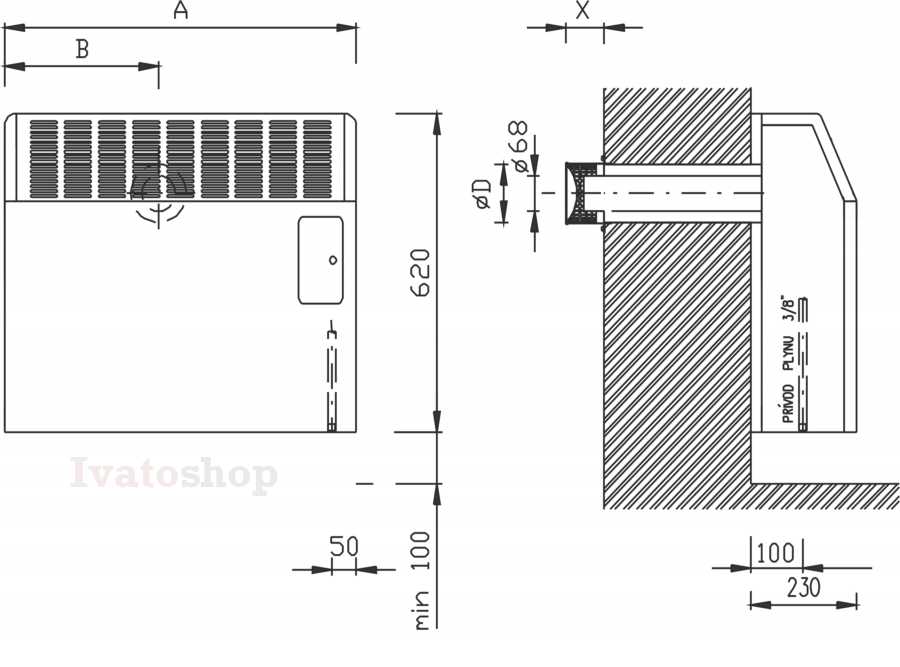 - vyústenie spalín cez vonkajšiu stenu až do hrúbky 60 cm, pri komínovej verzii PR - 2K vyústenie spalín do komína