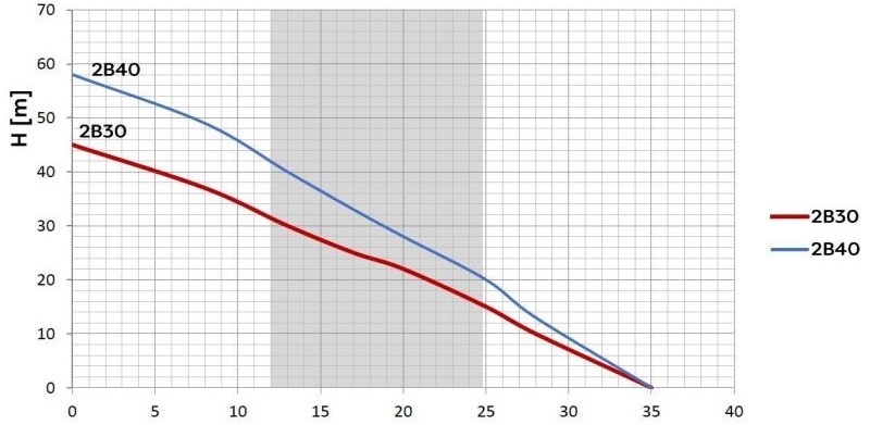 Ponorné čerpadlá 2B sú zariadenia s priemerom 50 mm, určené na inštaláciu do úzkych studní s priemerom minimálne 65 mm. Sú určené na čerpanie čistej, studenej vody bez pevných brúsnych, alebo dlhovláknitých prvkov.