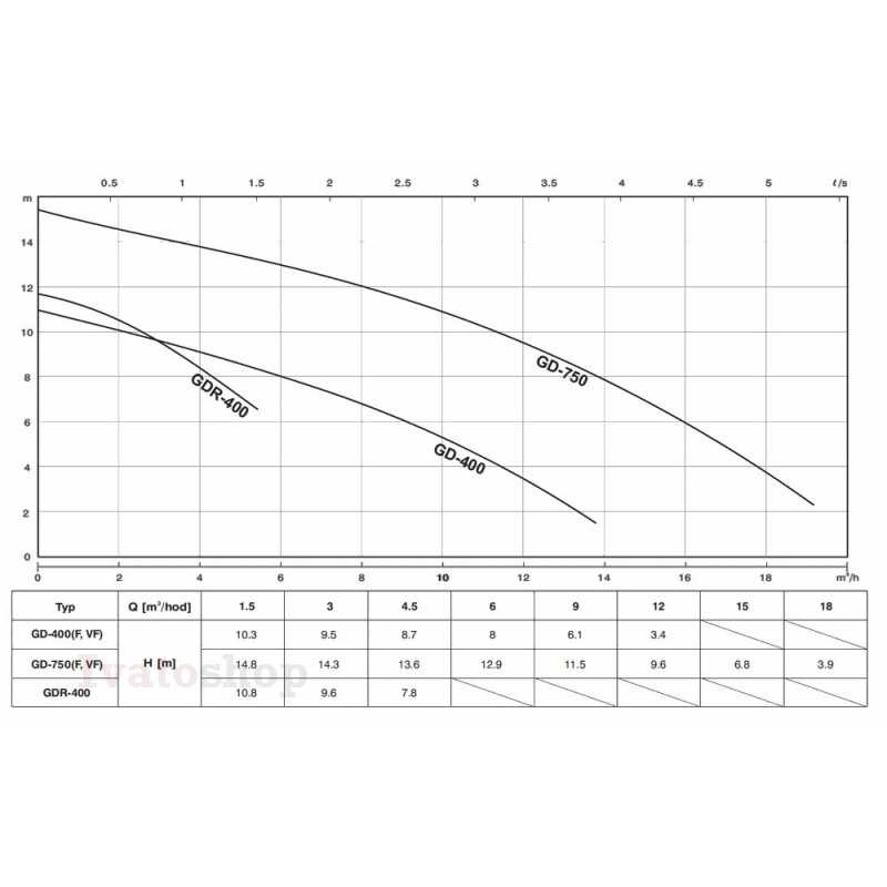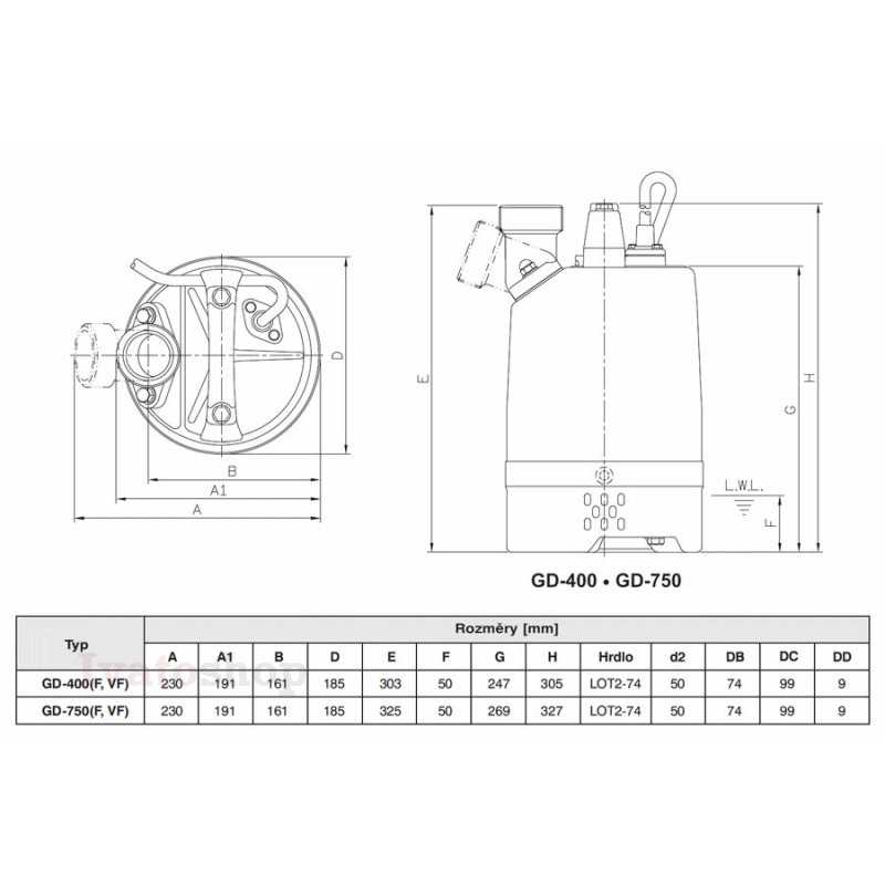 Obežné kolesá a špirály sú vyrobené zo špeciálnej gumy veľmi odolnej proti abrázii. Tým pádom lepšie odolávajú čerpanému médiu obsahujúceho drobné abrazívne nečistoty, ako je piesok, štrk, kamienky a iné abrazívne prímesy. Plavák automaticky čerpadlo zapína a vypína a chráni ho proti chodu na sucho. Výtlačné hrdlo čerpadiel GD je ukončené 2“ závitom s možnosťou našrubovania polspojky C52 alebo inej hadicovej koncovky.
