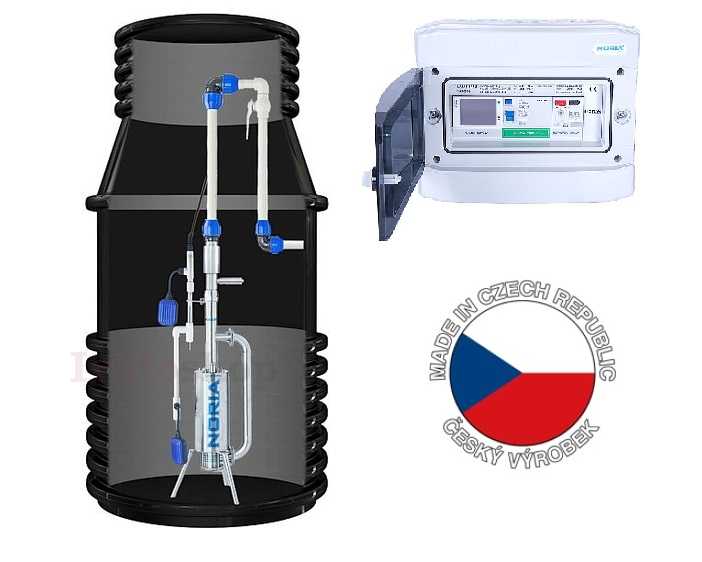 Systém tlakovej kanalizácie NORIA je založený na odvádzaní odpadových vôd pomocou objemového čerpadla umiestneného v čerpacej šachte, do ktorej sú samospádom odpadové vody z nehnuteľnosti zvedené. Čerpadlo vybavené drvičom nečistôt je riadené elektronicky. V okamihu, keď hladina dosiahne horný senzor snímača hladiny, dôjde k zopnutiu čerpadla a následnému vyčerpaniu šachty. Po vyčerpaní pod určitú hladinu v šachte čerpadlo opäť automaticky vypne. Záručná lehota je 36 mesiacov. Servis vykonávame priamo na mieste bez reklamačného poriadku 30 dní a to do 48 hodín od nahlásenia poruchy.