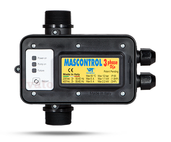 MASCONTROL 3PH spína trojfázové čerpadlá na základe prietoku a zníženého tlaku v systéme. Je vhodný obzvlášť pre silné čerpadlá s výkonom až do 2.2kW. Vďaka 5/4″ závitom znížite tlakové straty na minimum. Disponuje ochranou proti pretočeniu fáz.