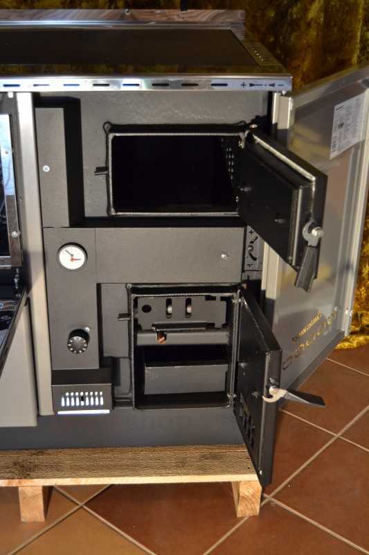 Sporák na drevo z nerezového plechu a kotlovej ocele na centrálne vykurovanie, varenie a pečenie