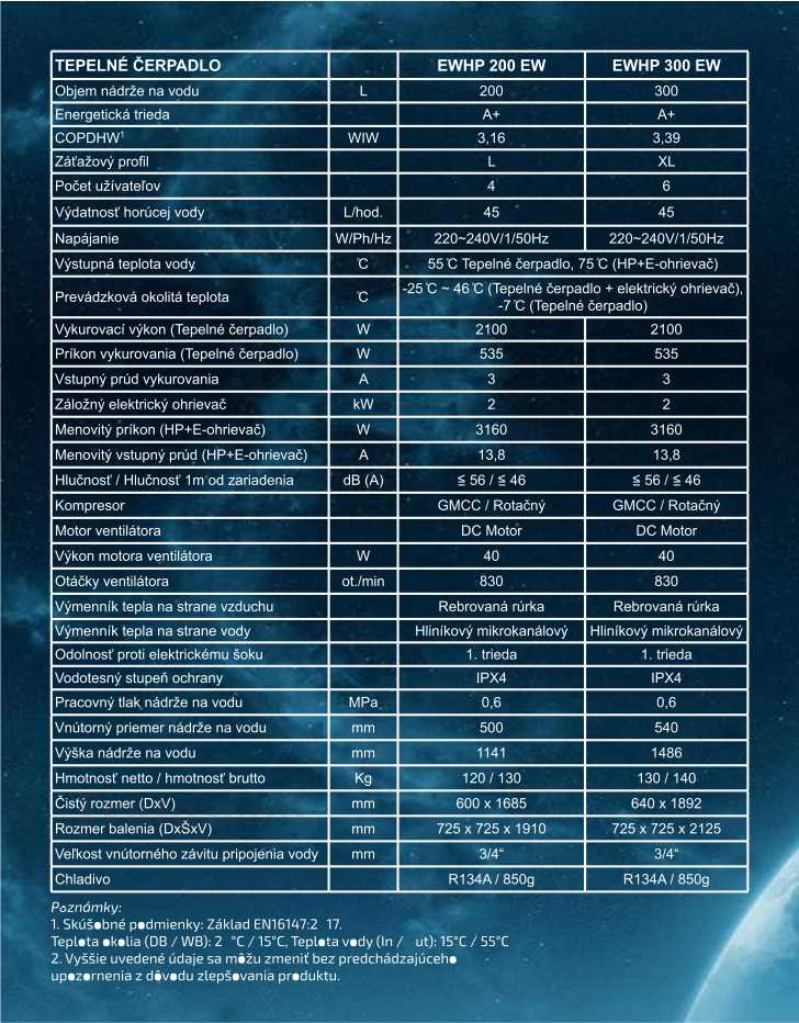 typ EWHP 200 EW príkon 2000 W napätie 230 V objem 200 lit. príkon tepelného čerpadla 535 W menovitý tepelný výkon 2100 W COP DWH 3,39 typ chladiva R134A istenie 16 A elektrické krytie IPX4 pripojenie vody G3/4 '' pracovná teplota okolia -20 až +46 °C hlučnosť 56 dB (A) max. tlak chladiva 2,6 MPa hmotnosť ohrievača 120 kg max. tlak vody v ohrievači 8 Bar rozmery ohrievača ( š / h / v) 600 x 600 x 1685 mm záruka na celý výrobok 2 roky