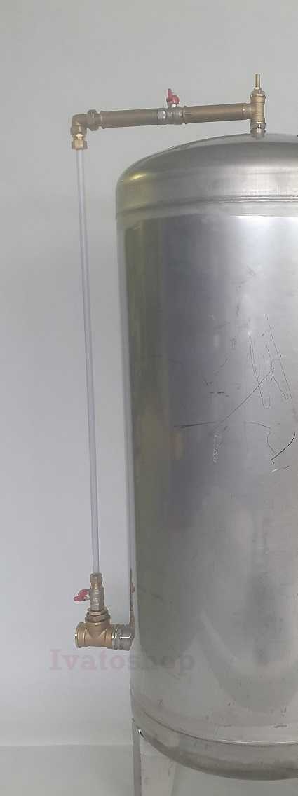 Vodoznak na určenie hladiny vody v nádobe, dodávaný s priehľadnou trubicou a dofukovacím ventilom.