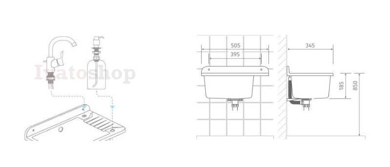 Drez Compact 505 je montovaný k stene, teda nie je potreba pracovnej dosky. Drez je možné umiestniť aj do kuchynskej linky (horná montáž). Je možné tiež odvŕtanie otvoru pre batériu alebo dávkovač saponátu či mydla. Súčasťou balenia sú montážne skrutky, sifón, prepad, výpusť, zátka a odbočka na umývačku.